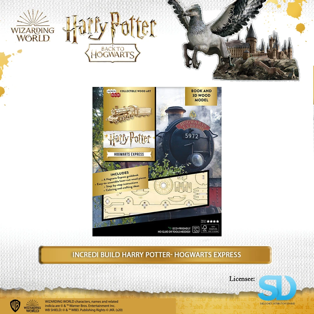In the Harry Potter films, young witches and wizards travel to Hogwarts School of Witchcraft and Wizardry via the Hogwarts Express—a magical train which leaves from Platform 9 ¾ in London. Now the famous train is yours to build and customize with this deluxe model set, accompanied by a 16-page booklet featuring concept art, unit photography, and other imagery from the films. The booklet is packed with interesting behind-the-scenes details, including notes from the filmmakers, cast commentary, and snapshots of key moments featuring the train. The wood model is easy to assemble and snaps together to form a dynamic displayable version of the Hogwarts Express that fans can color and craft any way they want!
